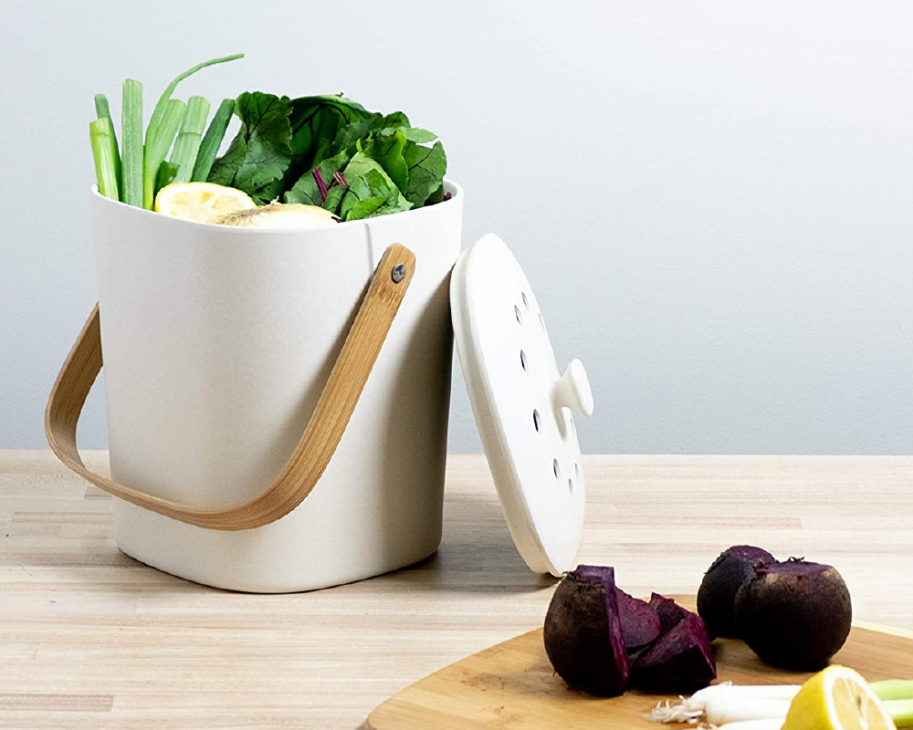 Buy on AmazonIf you are looking for a countertop Compost bin, this might be a little bit of a different option. While a regular compost bin decomposes the material turning it into a nutrient-rich soil enhancer or fertilizer, the Vitamix grinds, and heat process your food scraps. From banana peel to chicken bones, you can place almost everything inside it.